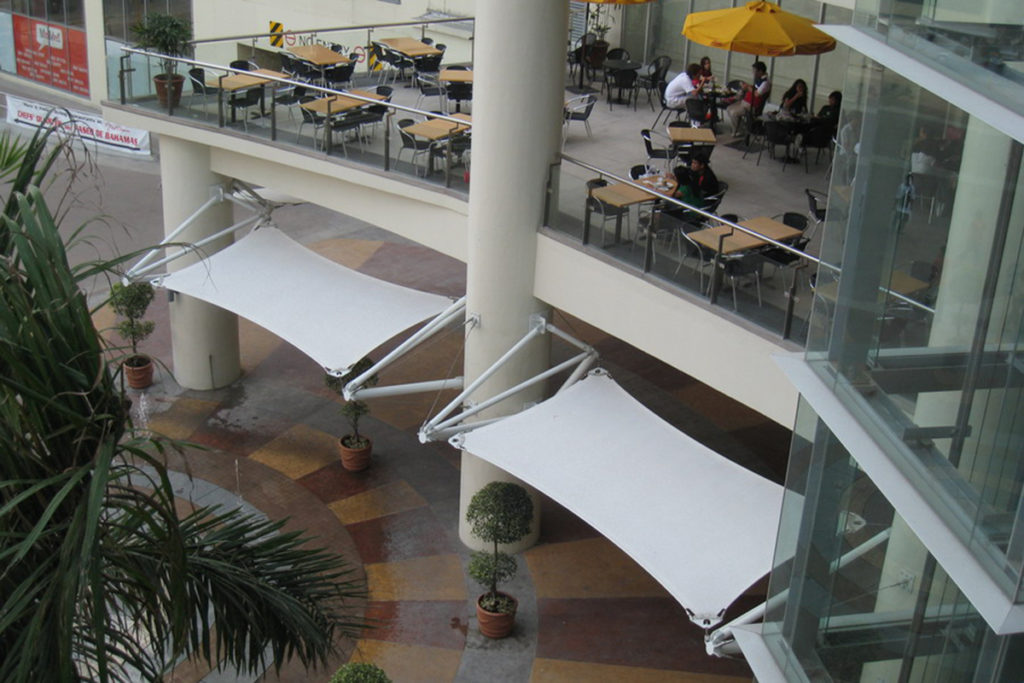Project building walkway canopy Robinsons Place Manila is a tensile membrane architectural solution specifically designed to be installed on an existing structure with many structural constraints. The project uses a lightweight structural system, supported by suspension cables, to create a continuous covered corridor without overloading the existing structure, while ensuring aesthetics and rapid construction progress.