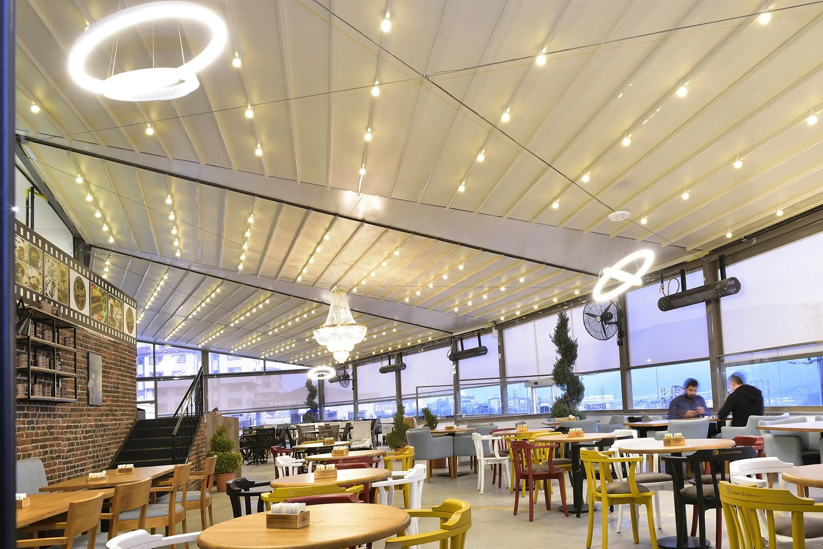 Mái hiên biệt thự bãi đỗ xe bằng bạt căng có thể được thiết kế cả cố định hoặc di động, kết hợp hệ thống đèn LED đi kèm. Cả hai hệ mái đều được bố trí đủ độ nghiêng để thoát nước mái và nhờ sức căng bề mặt của lớp bạt căng, đảm bảo thoát nước mưa về điểm thu nước và hoạt động như một lớp màng cứng, đảm bảo độ ổn định cao đối với các tác nhân bên ngoài.